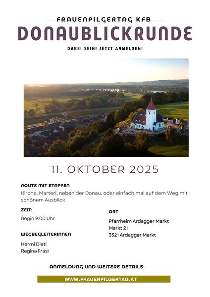 11. Oktober 2025 Frauenpilgertag DABEI SEIN! JETZT ANMELDEN! unter: https://www.frauenpilgertag.at/institution/885201/kalender/calendar/23914276.html mehr: Frauenpilgertag