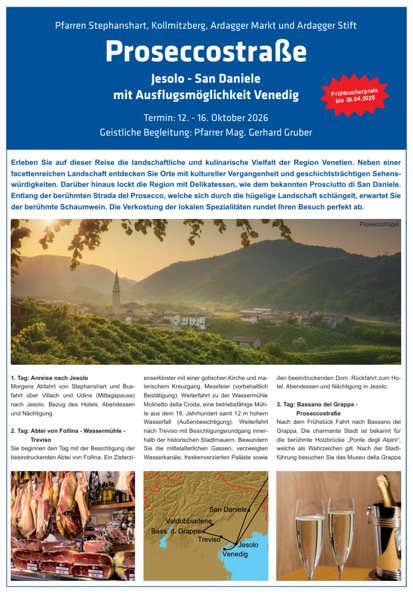 Proseccostraße - Jesolo/San Daniele mit Ausflugsmöglichkeit Venedig Pfarrverbandsreise Anmeldung bei Mag. Gerhard Gruber oder im Pfarrbüro unter pv-ardagger@dsp.at: Pfarrverbandsreise