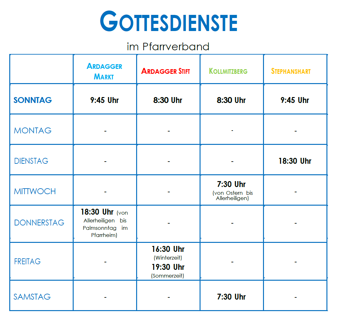 Sollte in einer Pfarre, in der regulär ein Wochentagsgottesdienst stattfände, an diesem Tag ein Begräbnis sein, entfällt der Wochentagsgottesdienst, die Gottesdienste in den anderen Pfarren sind davon nicht betroffen. Tauftermine in den Pfarren sind jeweils an Samstagen oder Sonntagen um 11.00 Uhr. Bei Sonderfeiern in den Pfarren (Erstkommunion, Erntedank, ……….) kann es zu Abweichungen von den regulären Gottesdienstzeiten kommen – bitte der Homepage der jeweiligen Pfarre entnehmen! |