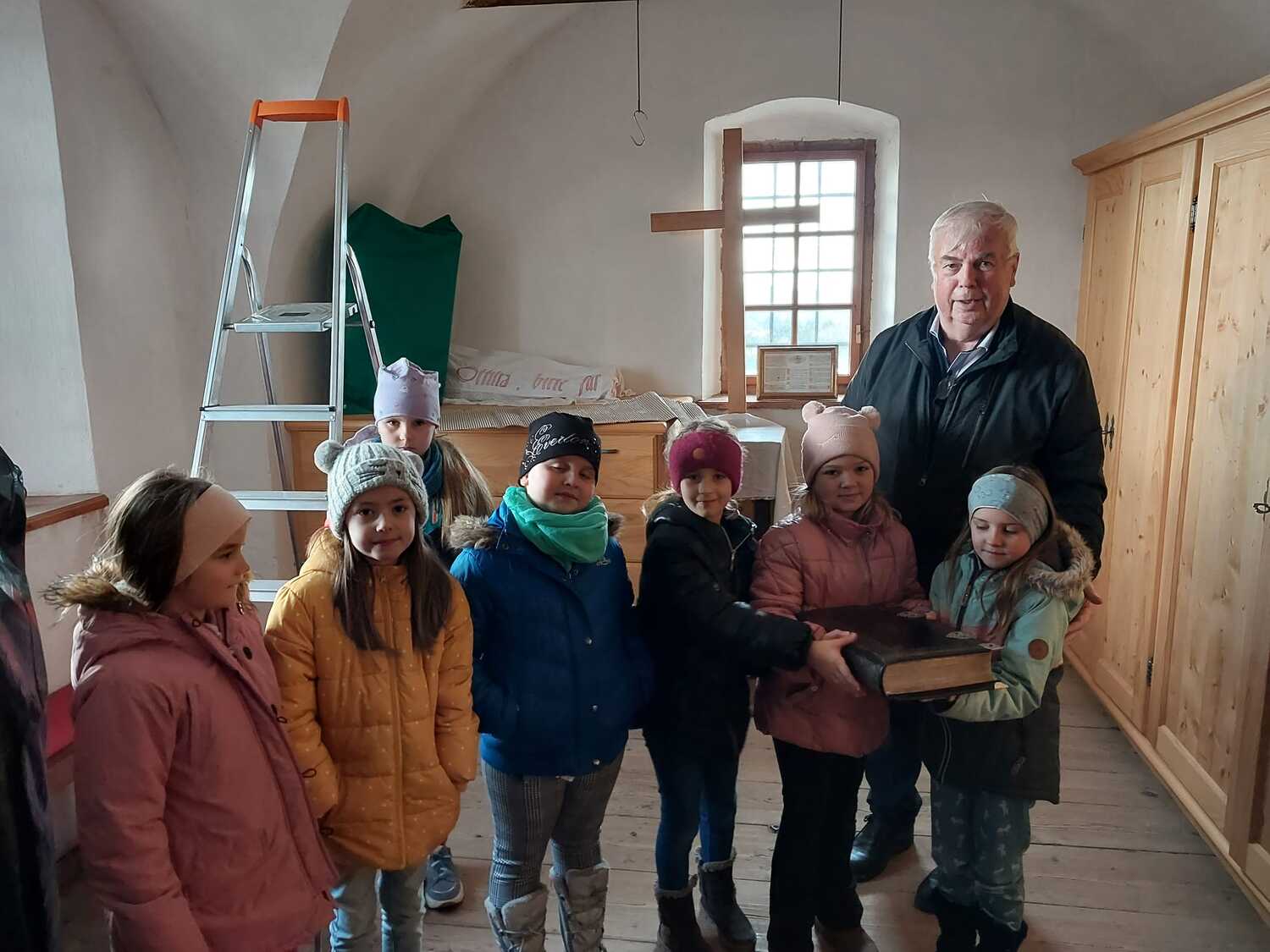 Am 20. Februar lud unser Hr. Pfarrer die Erstkommunionkinder zu einer gemeinsamen Besichtigung unserer Pfarrkirche ein. Niemand kennt die verborgenen und versteckten Winkeln besser, als unser Hr. Pfarrer. So war es auch für die Eltern etwas ganz besonderes, wenn man ganz oben am Turm steht, und die Glocken beginnen zu läuten. Auch oberhalb der Sakristei liegt ein ganz besonderer Schatz versteckt. Die Kinder waren mit großer Begeisterung und mit viel Elan dabei. Die Türen unserer Pfarrkirche sind natürlich für alle immer offen.