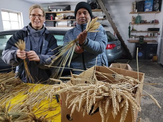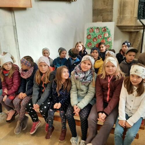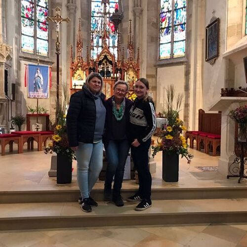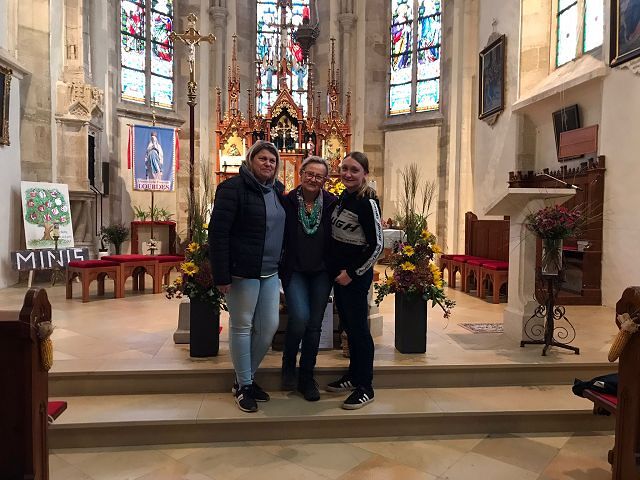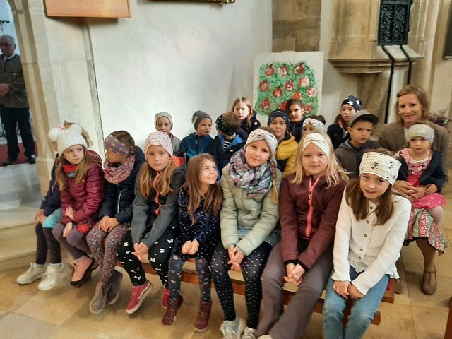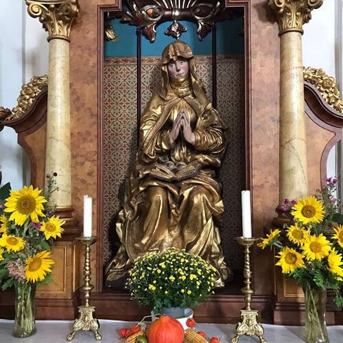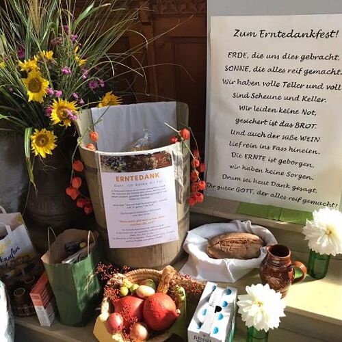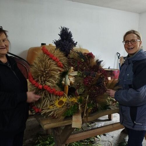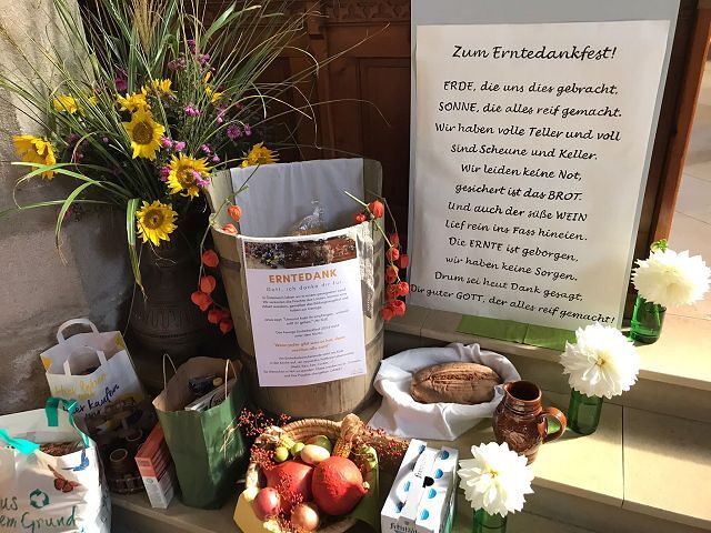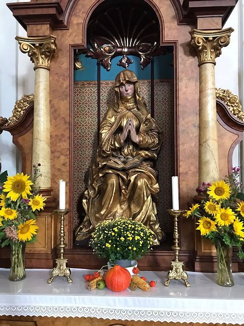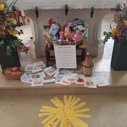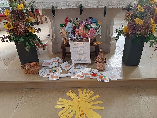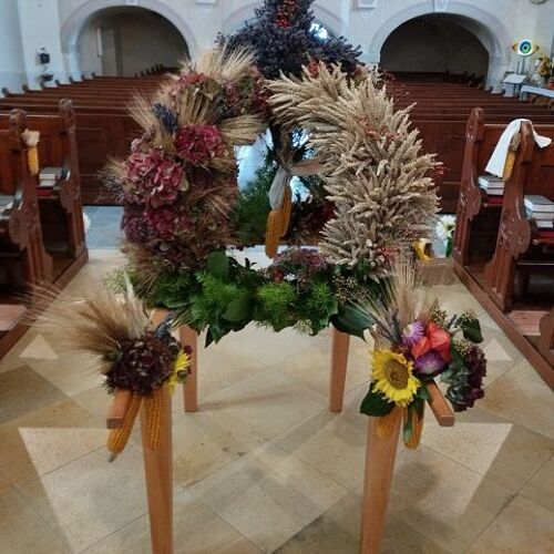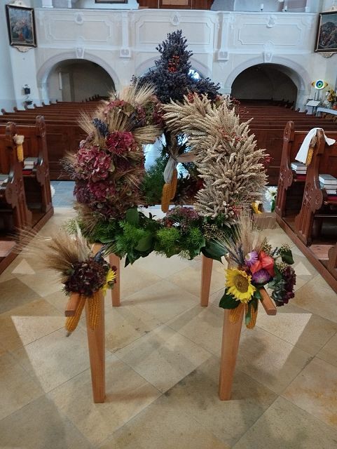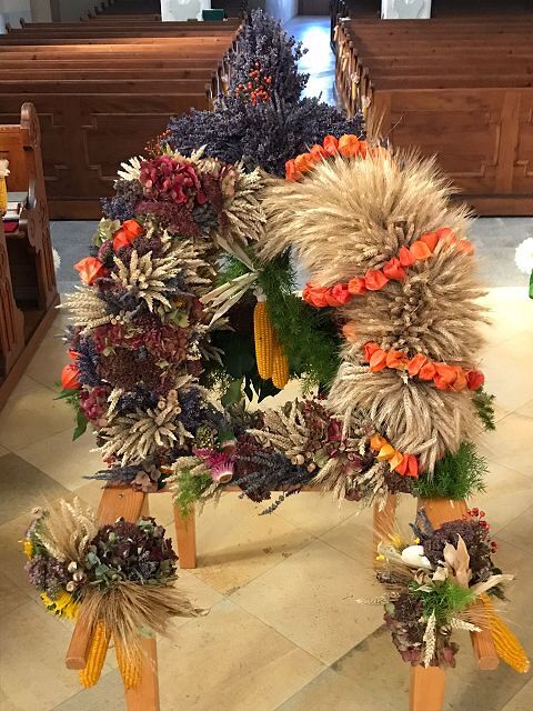 Am 06. Oktober feierten wir das Erntedankfest. Viele haben mitgeholfen, dass wir dieses Fest so stimmungsvoll feiern konnten. Der Kinderchor traf sich am Samstag zu einer Probe, und Gerti, Traudi und Gabi banden die wunderschöne Erntedankkrone. Auch unser Pfarrer Biju half fleißig mit. Christl, Monika und Karin zeigten sich wieder für den liebevollen Blumenschmuck verantwortlich.