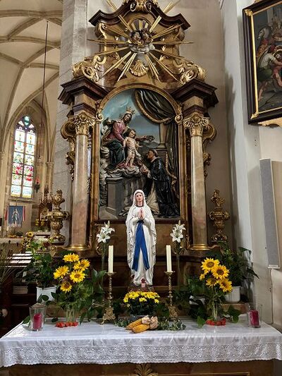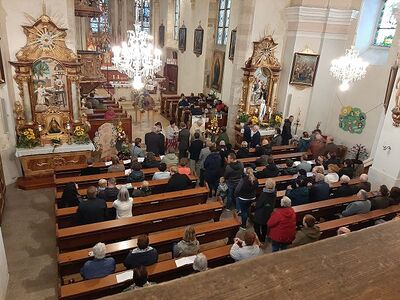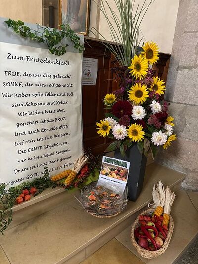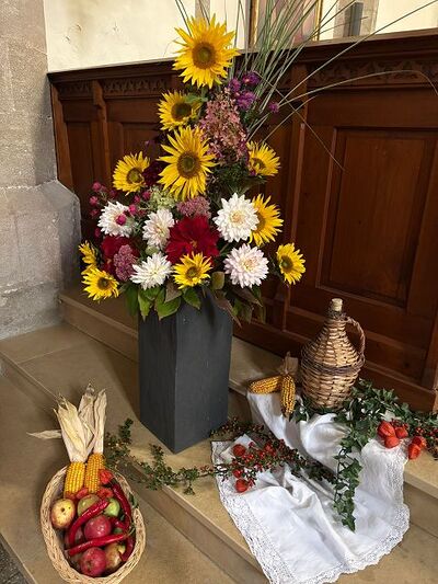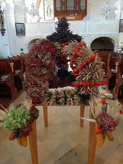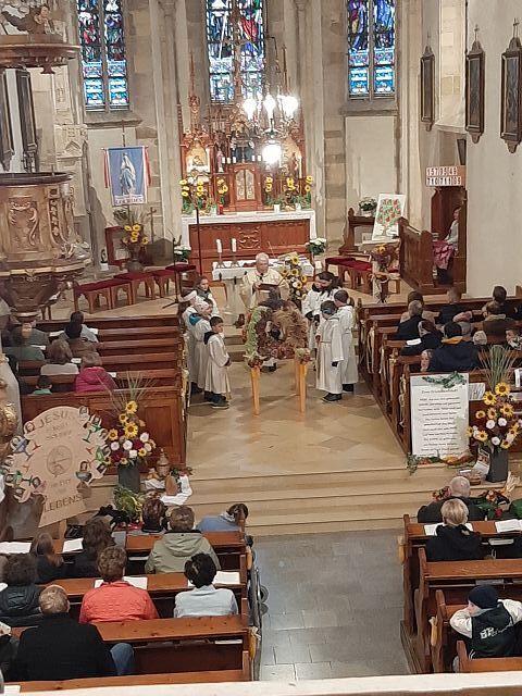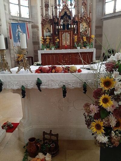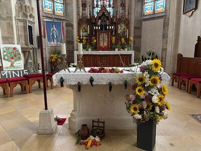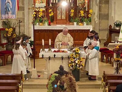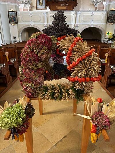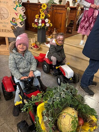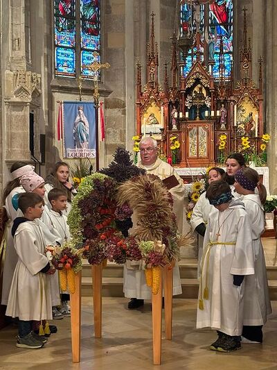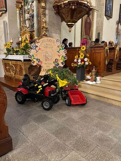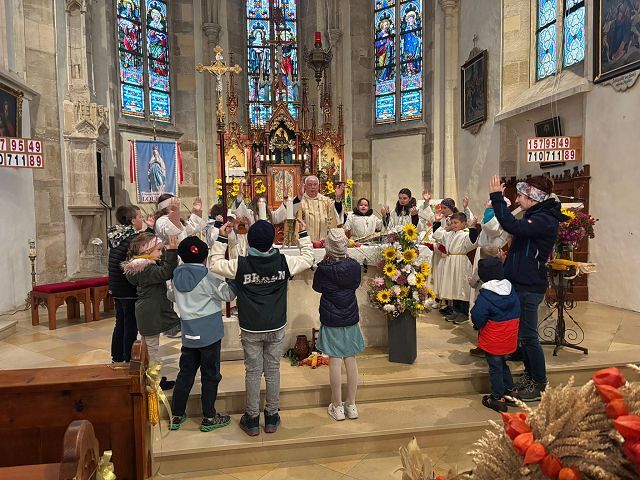 Am 05. Oktober feierten wir in unserer Pfarre das Erntedankfest. Die Segnung der Erntedankkrone wurde aufgrund des Regens kurzerhand in der Kirche durchgeführt. Danke an die Jugend, die sich bereiterklärt hätte, die Erntedankkrone in die Kirche zu tragen. Gemeinsam feierten wir mit unseren Hr. Pfarrer den Gottesdienst. Dieser wurde von einer Bläsergruppe des MV und der Gitarrengruppe mitgestaltet. Auch einige Kinder trotzten dem Wetter, und kamen mit ihren Fahrzeugen in die Kirche. Ebenso durfte unser Hr. Pfarrer fünf neue Minis begrüßen. Nach dem Schnuppern freut es uns sehr, dass wir die Kids offiziell willkommen heißen durften. Im Anschluss luden wir noch zu einer Agape in unser neues Pfarrheim ein. Das erste Mal durften wir unsere Türen offiziell für die Pfarrbevölkerung öffnen...es freut uns sehr, dass soviele der Einladung gefolgt sind. Dies ist für uns ein besonderes Zeichen der Wertschätzung und der Unterstützung.