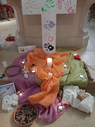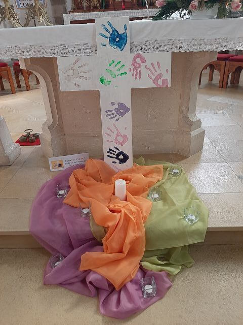 Ebenso das Kreuz vor dem Altar wurde von den Firmlingen gestaltet.