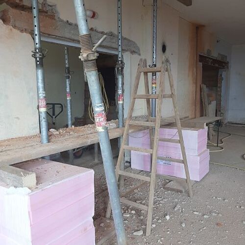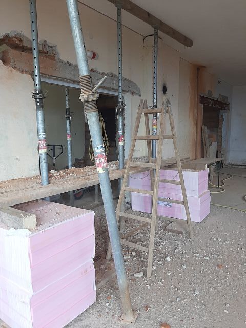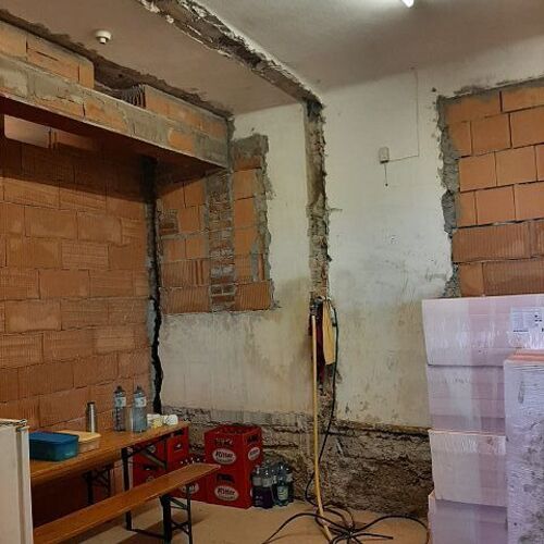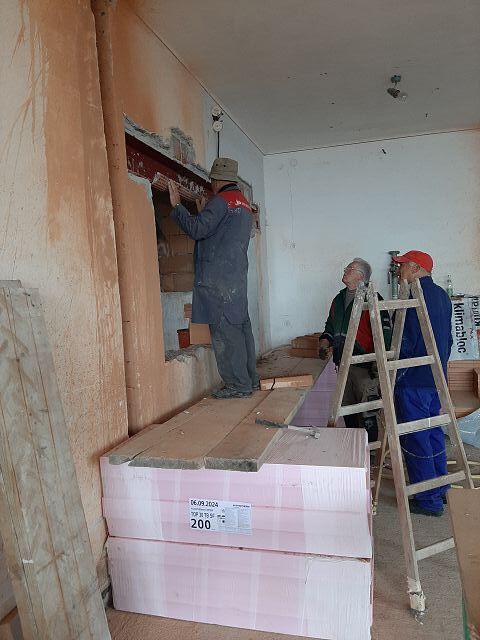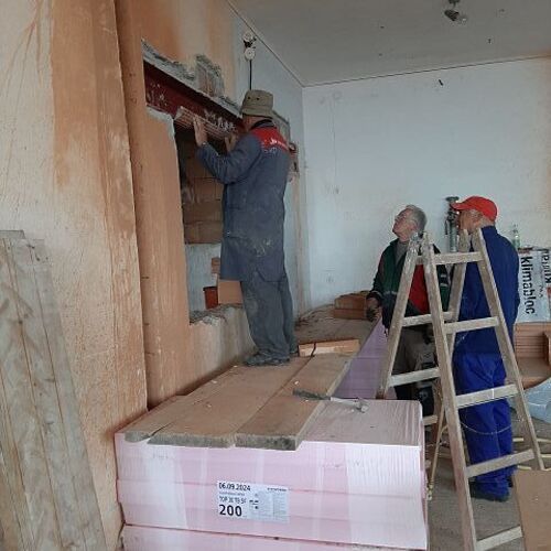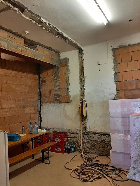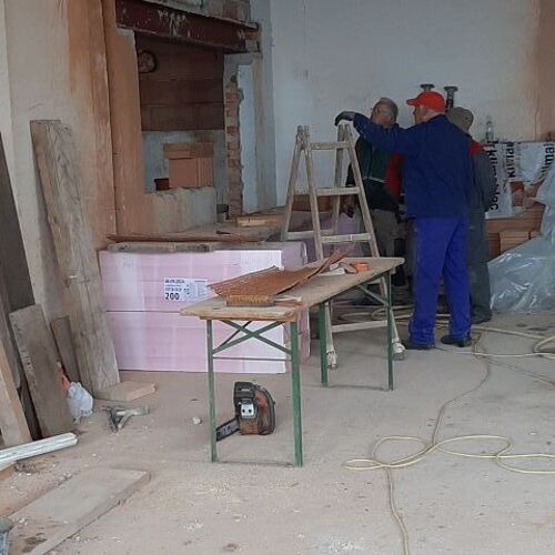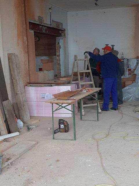 Vor dem Wochenende wurde unser "Jausenquartier" bereits in unsere pfarrlichen Räume verlegt, da oben bereits seitens der Gemeinde begonnen wurde. Göbl Fritz machte das Nötigste am Strom, sodass wir bereits in "unserer" Pfarrheimküche zum Jausnen Strom haben.