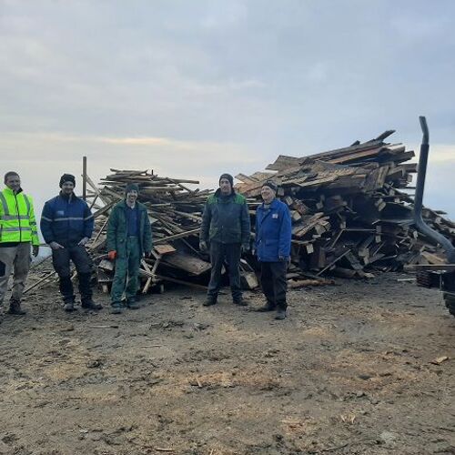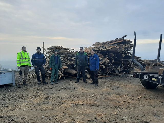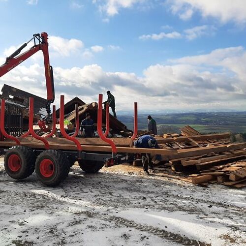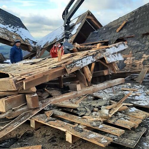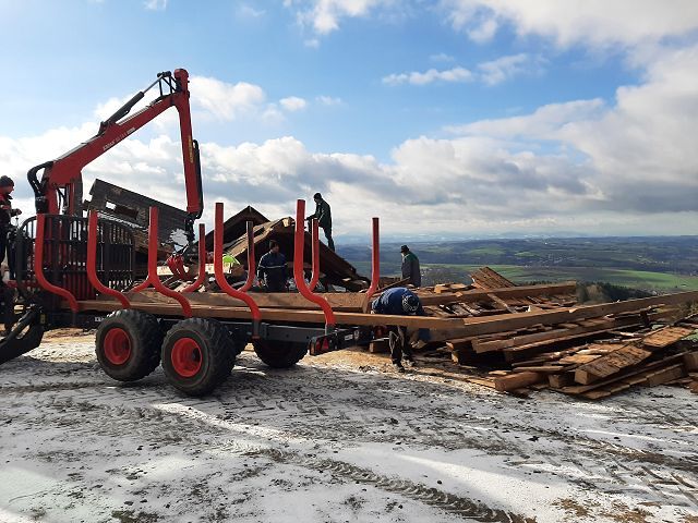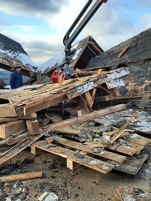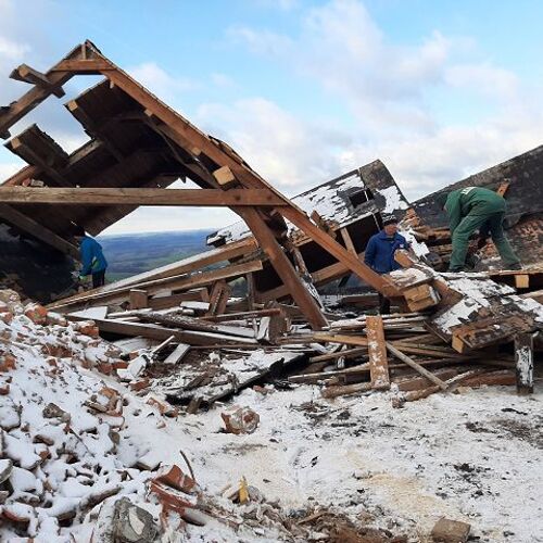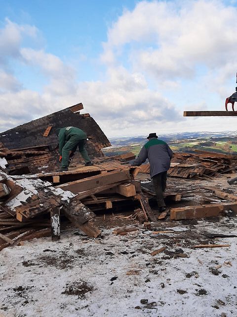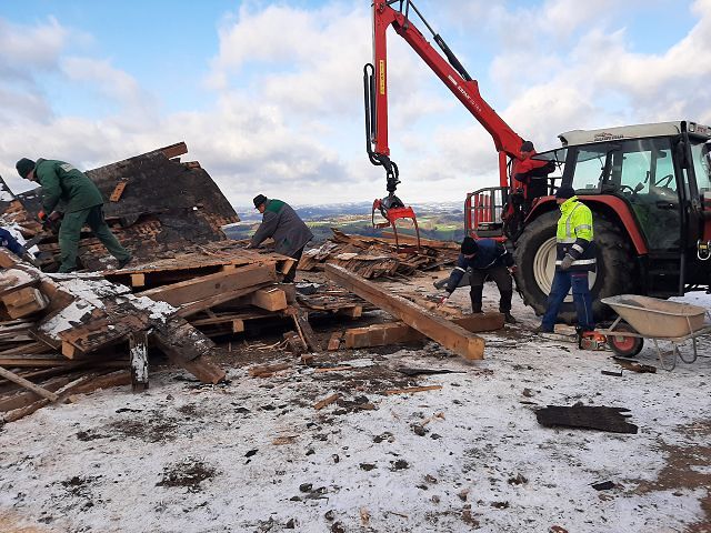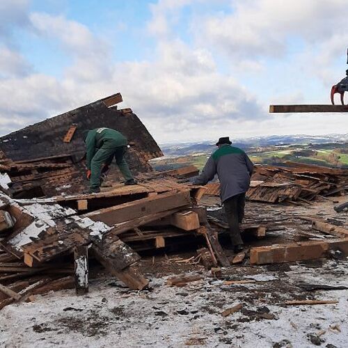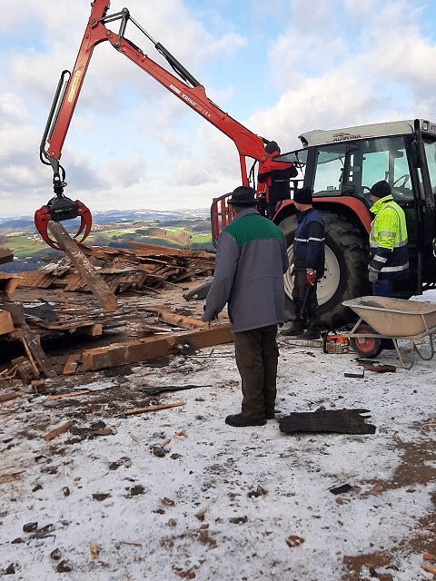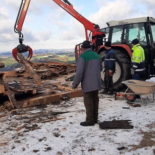 Ende November halfen noch einmal einige Männer zusammen, um den Dachstuhl zu zerlegen und zu entnageln. Da war natürlich der Einsatz eines Traktors von Vorteil. Herzlichen Dank, dass ihr trotz des kalten Wetters verlässlich gearbeitet habt.