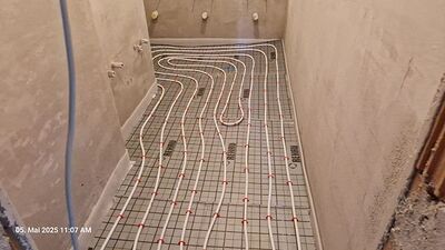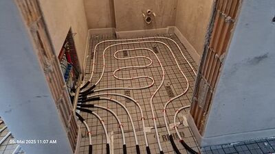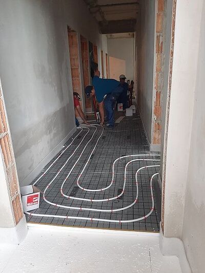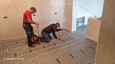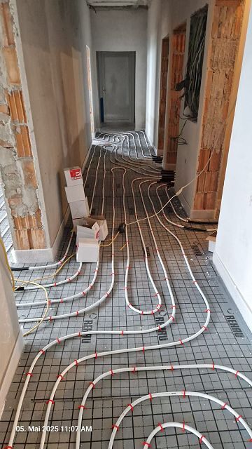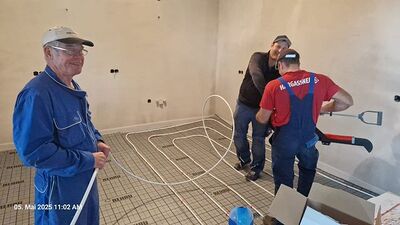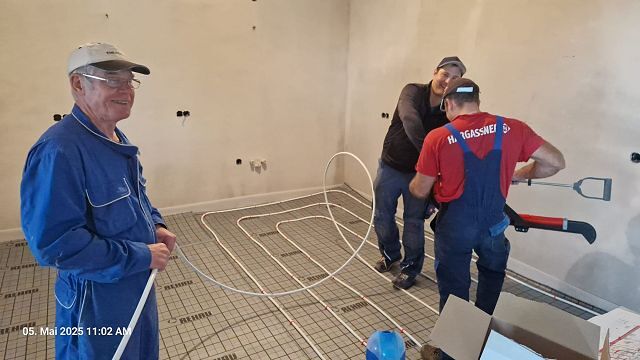 Danach ging es am Montag mit unserem Installateur Pressl Lukas auch schon weiter. Aigner Franz und Haunschmid Andreas unterstützten ihn beim Legen der Fußbodenheizung. So war auch diese Arbeit an einem Tag erledigt.